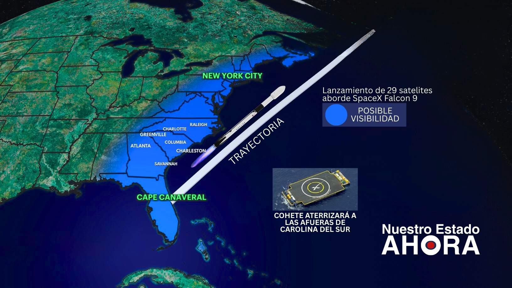 Después del despegue, la primera etapa del cohete —con número de serie B1078— intentará regresar y aterrizar en la plataforma autónoma “Just Read the Instructions”, ubicada en el Océano Atlántico frente a la costa de Carolina del Sur.